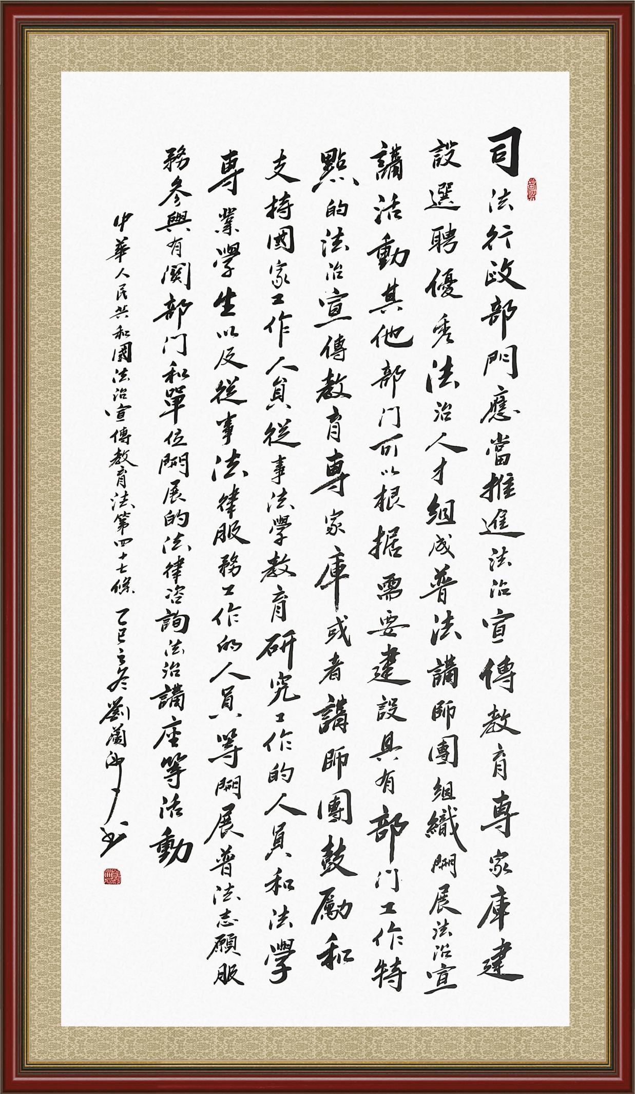 2020年7月11日,由法治日報社主辦的“書·法”系列活動正式啟動,先后書寫《中華人民共和國民法典》《中華人民共和國憲法》《中華人民共和國民營經濟促進法》等21部法律法規(guī)。