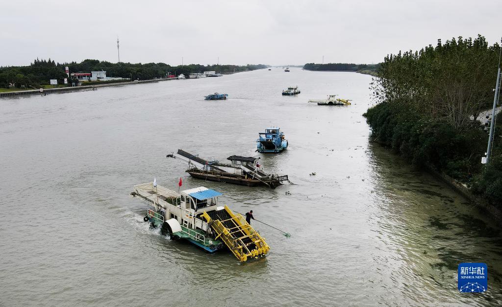 蘇浙滬三地的保潔船在太浦河水域聯(lián)合清理水面浮游植物(2020年10月15日攝,無人機照片)。當(dāng)日,來自蘇州市吳江區(qū)、上海市青浦區(qū)和嘉興市嘉善縣的三名河長在位于長三角生態(tài)綠色一體化發(fā)展示范區(qū)的蘇浙滬交界水域太浦河流域附近開展聯(lián)合巡河活動。新華社記者 方喆 攝