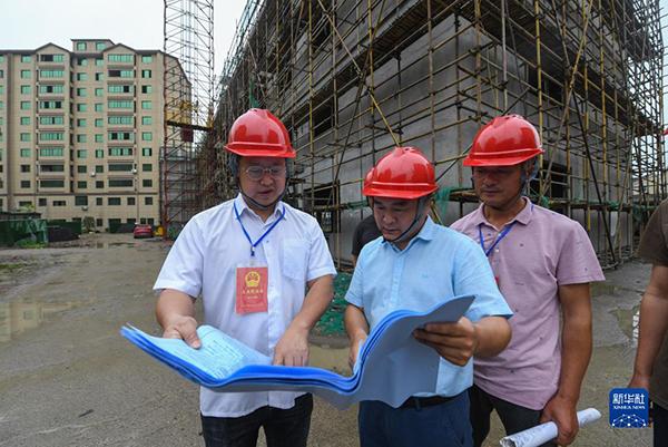 在浙江省湖州市吳興區(qū)東林鎮(zhèn)星火村,當地人大代表及村民代表對星火村農民新村建設項目的施工進展情況進行監(jiān)督檢查(2021年6月2日攝)。新華社記者 徐昱 攝