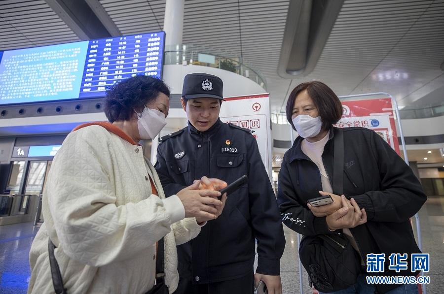 重慶西站候車廳,鐵路民警向旅客講解如何識(shí)別非法網(wǎng)站。新華網(wǎng)發(fā)(胡勇 攝)