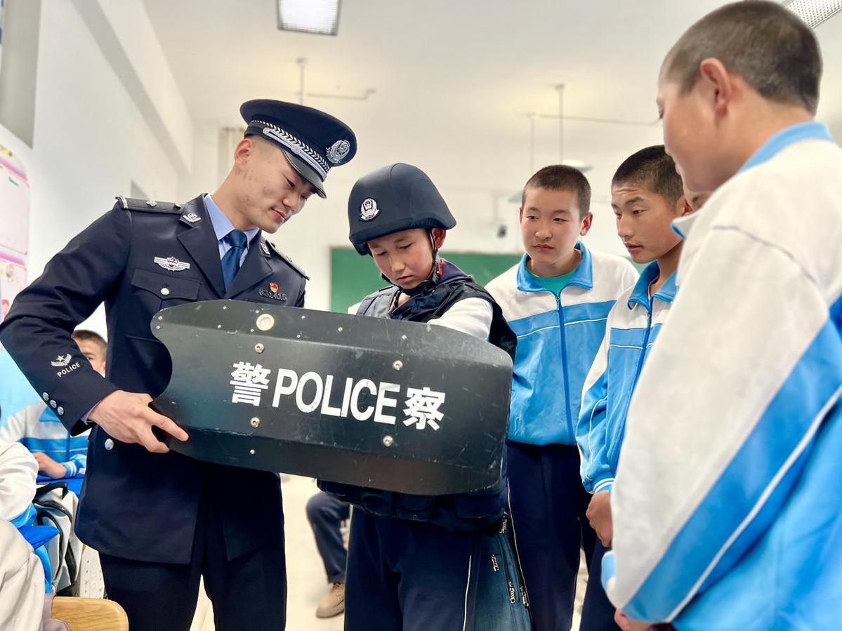 圖為2023年4月11日,民警正在向學生講解警務器材。