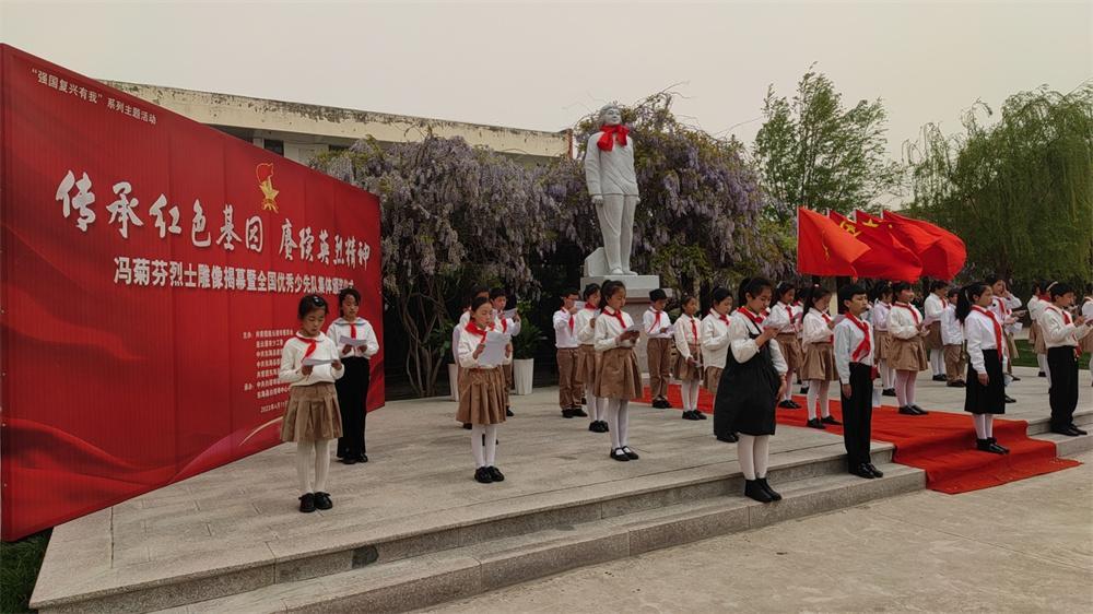 活動現(xiàn)場,出席儀式的幾位領導和少先隊員代表緩緩地為“雨花英烈”之一的馮菊芬烈士塑像揭幕,褪去紅布的烈士塑像在藍天白云下愈顯純潔高大、莊嚴而肅穆。