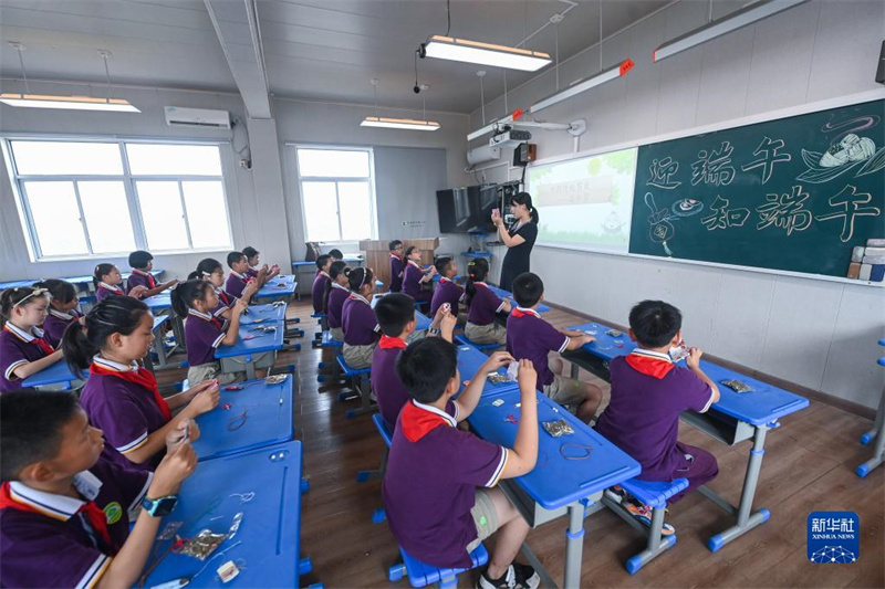 6月8日,學(xué)生們?cè)趥鹘y(tǒng)習(xí)俗課上學(xué)習(xí)包粽子。