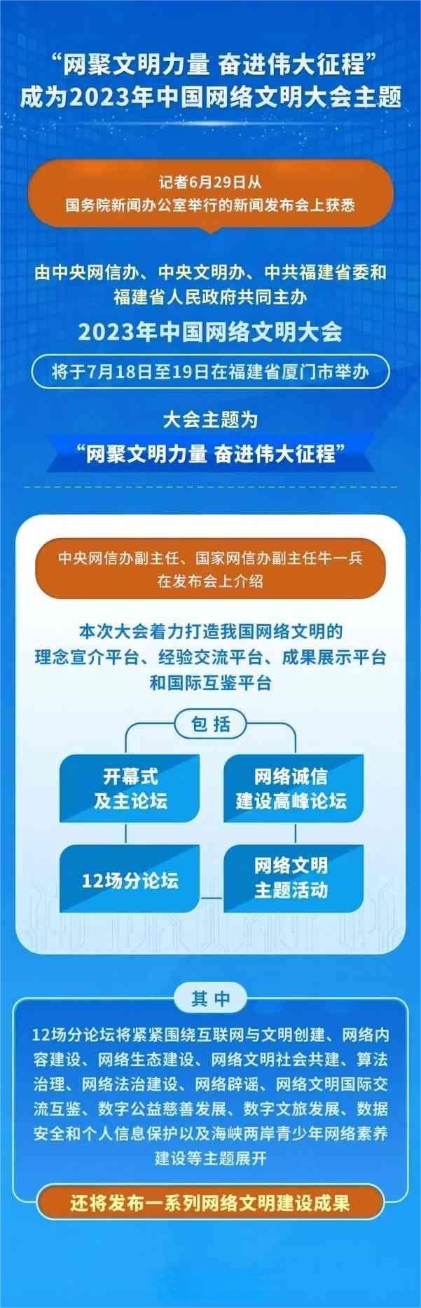 記者6月29日從國務院新聞辦公室舉行的新聞發(fā)布會上獲悉,由中央網(wǎng)信辦、中央文明辦、中共福建省委和福建省人民政府共同主辦,2023年中國網(wǎng)絡文明大會將于7月18日至19日在福建省廈門市舉辦,大會主題為“網(wǎng)聚文明力量 奮進偉大征程”。