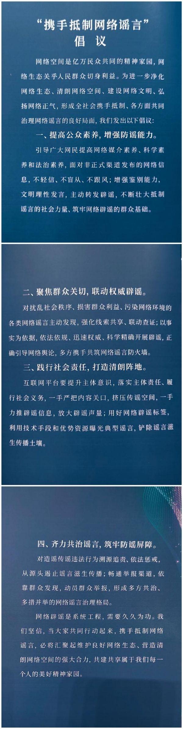 網(wǎng)絡(luò)空間是億萬民眾共同的精神家園,網(wǎng)絡(luò)生態(tài)關(guān)乎人民群眾切身利益。為進一步凈化網(wǎng)絡(luò)生態(tài)、清朗網(wǎng)絡(luò)空間、建設(shè)網(wǎng)絡(luò)文明、弘揚網(wǎng)絡(luò)正氣,形成全社會攜手抵制、各方面共同治理網(wǎng)絡(luò)謠言的良好局面,本次論壇發(fā)布了《“攜手抵制網(wǎng)絡(luò)謠言”倡議》。