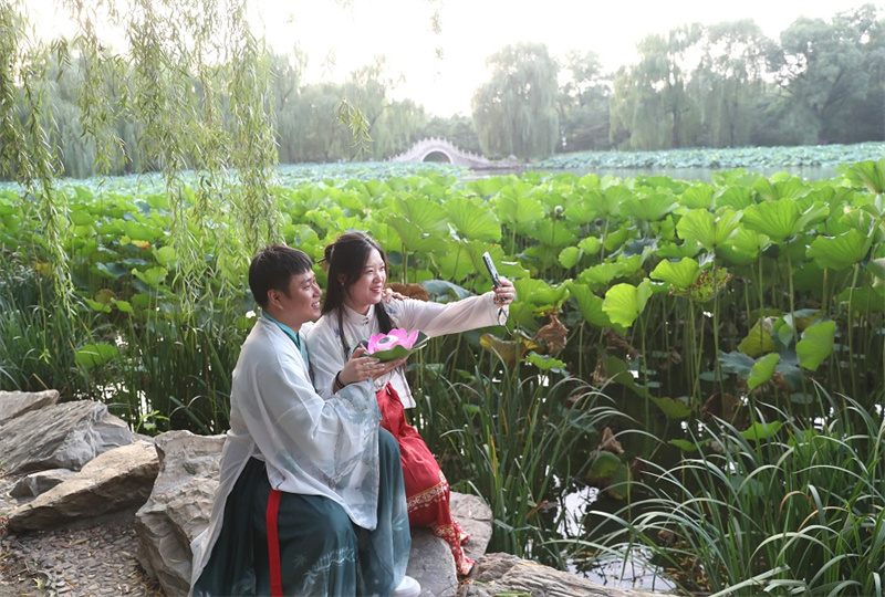 8月20日,身著漢服的游客手拿荷燈合影。中國日?qǐng)?bào)記者 鄒紅 攝