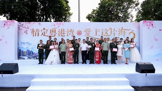 “愛意翻山渡海,終抵良人身畔。今天我們在此,和天空,和海疆,和艦艇一起見證這11對新人人生最重要的時刻?!彪S著愛情的煙花在天空綻放,幸福的汽笛在海疆長鳴,熱烈的鑼鼓在廊道敲響,11對新人在親友和來賓的祝福中從海警艦艇緩步走向“情定粵港灣·愛上這片?!奔w婚禮的舞臺。
