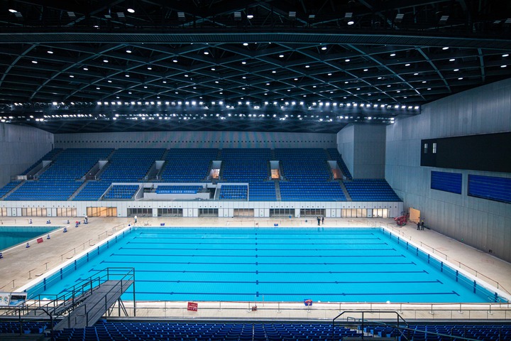 這是2021年4月12日拍攝的杭州奧體中心游泳館內(nèi)景。新華社記者 江漢 攝