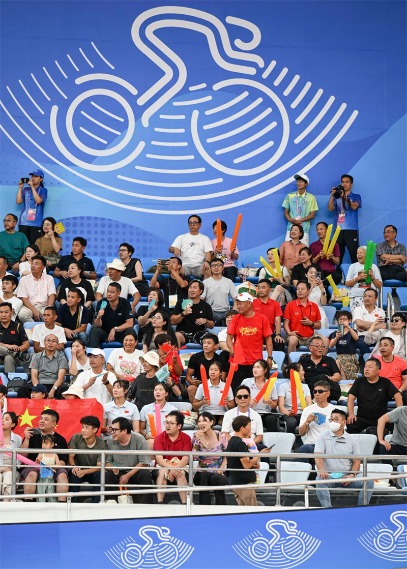 9月26日,觀眾在杭州亞運(yùn)會(huì)場地自行車男子團(tuán)體競速賽場邊觀賽。新華社記者 胡虎虎 攝