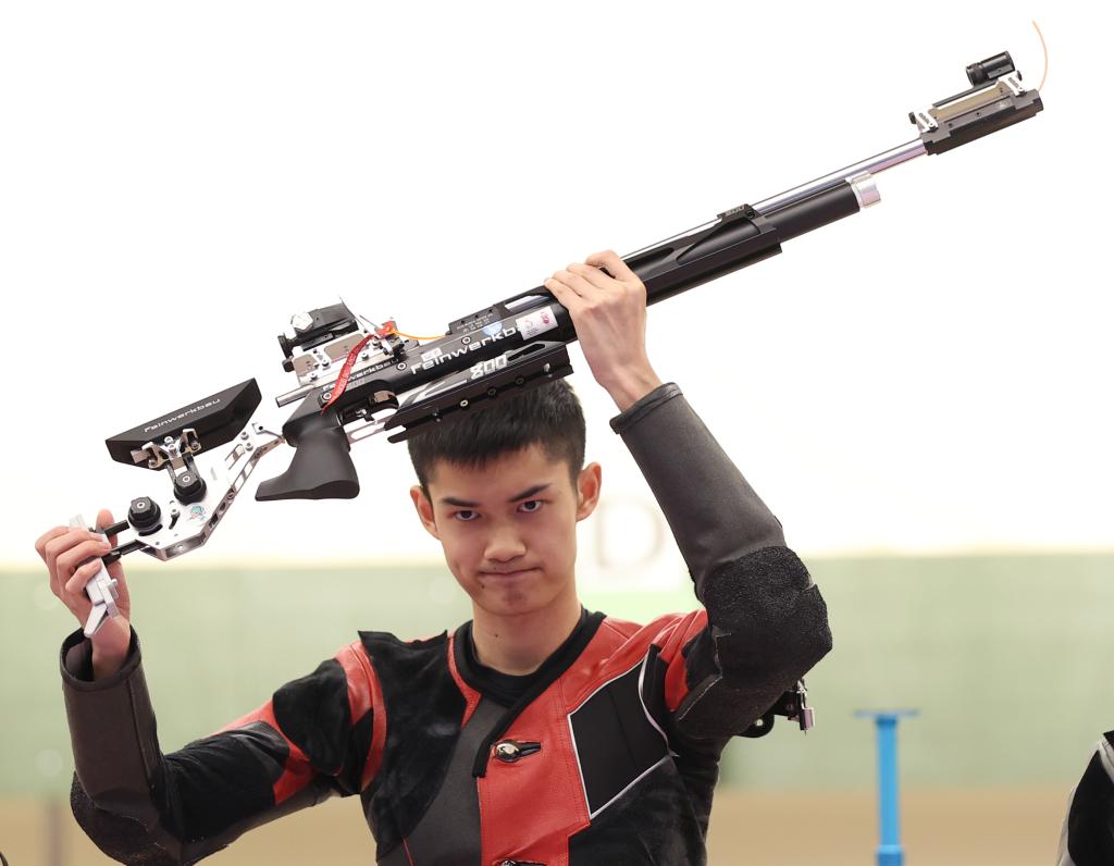 9月25日,杭州亞運會射擊項目男子10米氣步槍個人決賽中,中國選手盛李豪以253.3環(huán)的成績奪冠,并打破該項目世界紀(jì)錄。新華社記者 賈浩成 攝