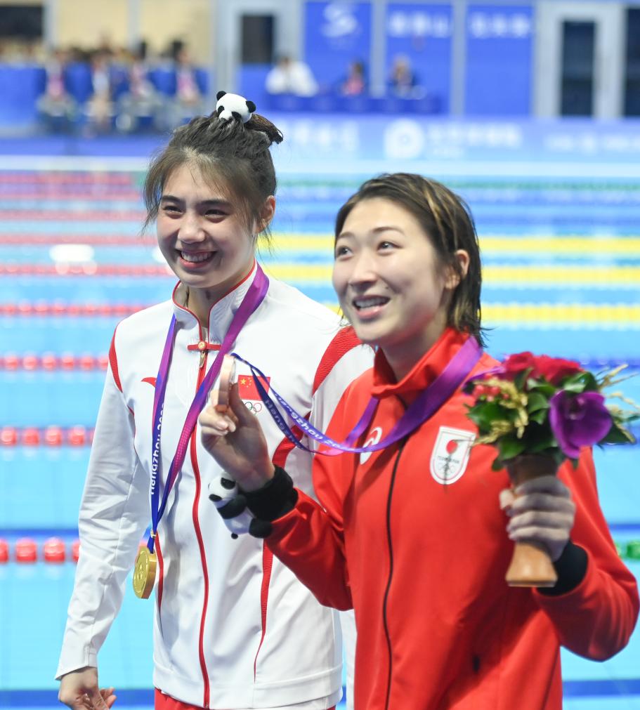 9月29日,冠軍中國選手張雨霏(左)和季軍日本選手池江璃花子在頒獎儀式后。新華社記者 黃宗治 攝