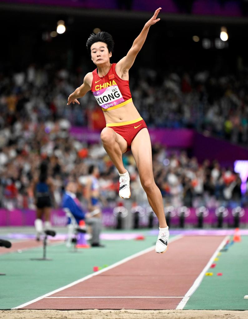 在女子跳遠賽場,中國19歲小將熊詩麒憑借第三跳跳出的個人最好成績6米73,將冠軍收入囊中,為中國隊收獲當日第二金。