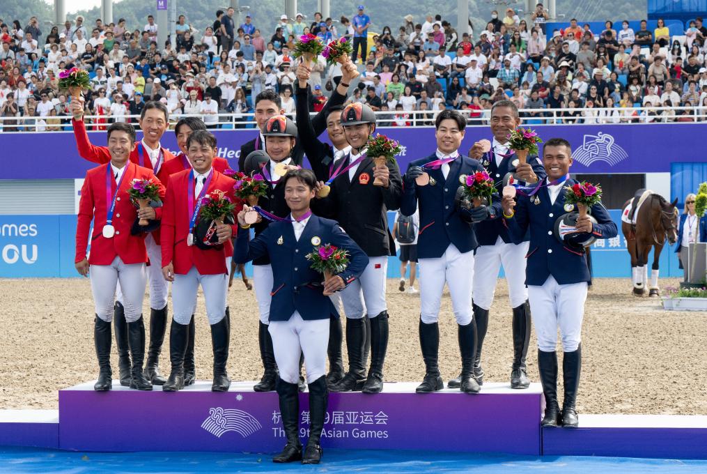 10月2日,在桐廬馬術中心舉行的杭州亞運會馬術項目三項賽團體賽結束。中國隊獲得冠軍,日本隊和泰國隊分獲亞軍、季軍。新華社記者 魏培全 攝