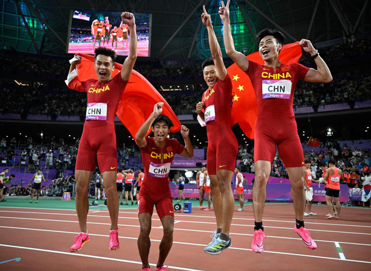 拿下這兩枚金牌后,中國隊(duì)創(chuàng)造了一項(xiàng)歷史:在同一屆亞運(yùn)會中,首次由一個(gè)代表團(tuán)包攬男女100米和男女4×100米接力金牌。在杭州,“中國速度”屹立亞洲之巔!