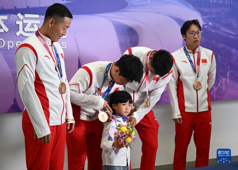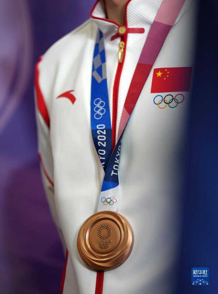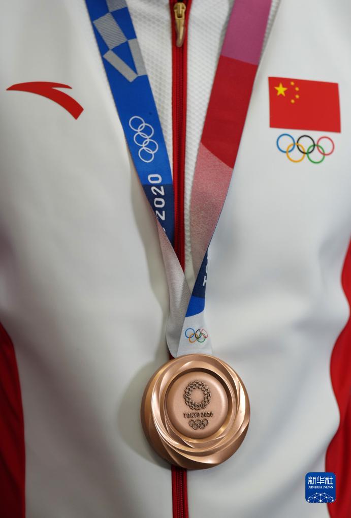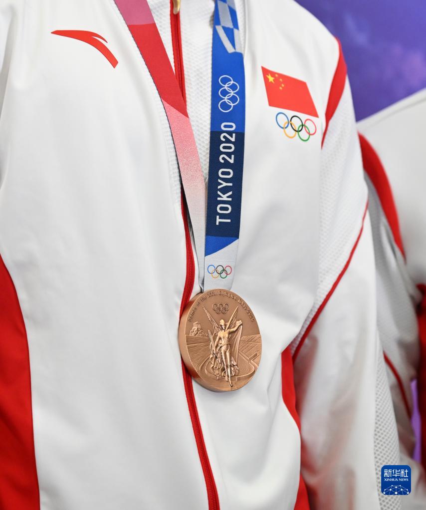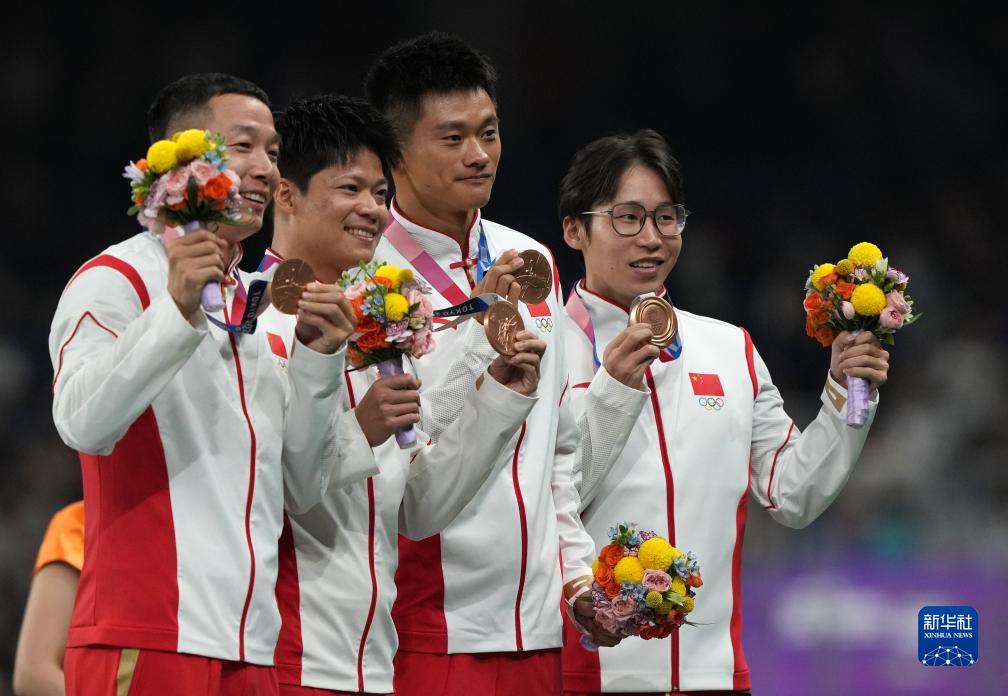 這是湯星強(qiáng)、謝震業(yè)、蘇炳添、吳智強(qiáng)遞補(bǔ)獲得的東京奧運(yùn)會(huì)男子4X100米接力銅牌(10月4日攝)。