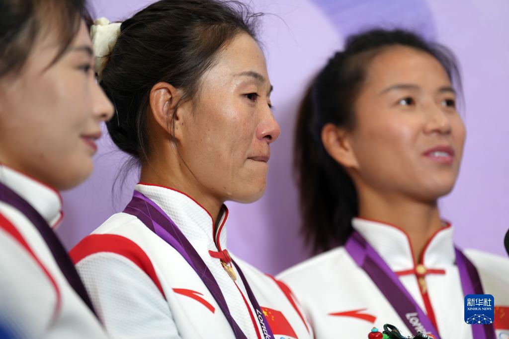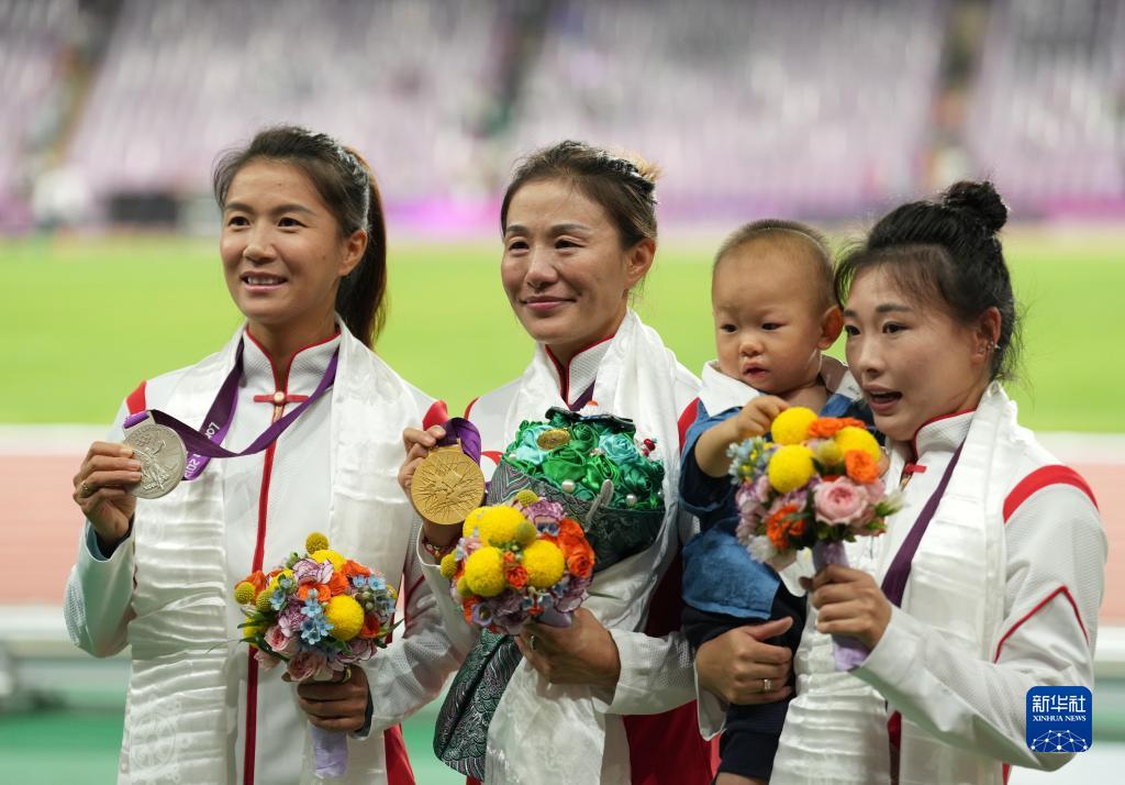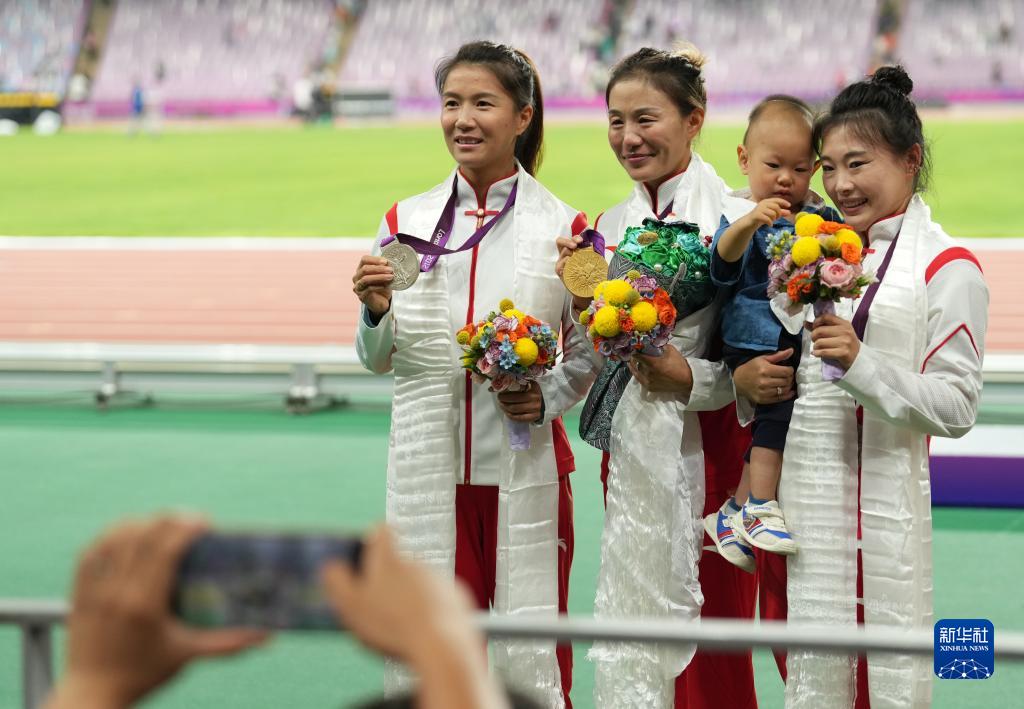 10月4日,切陽(yáng)什姐(中)、劉虹(右)、呂秀芝(左)在頒獎(jiǎng)儀式后展示獎(jiǎng)牌。