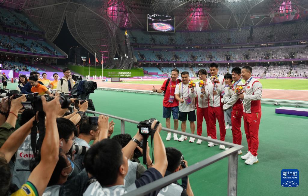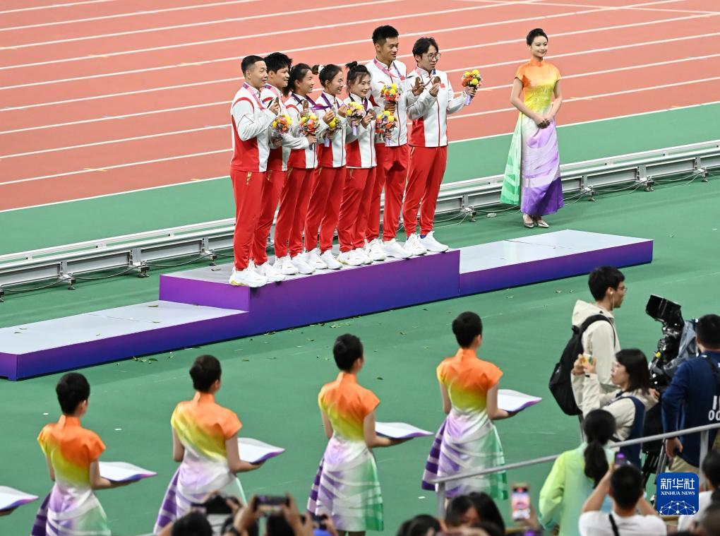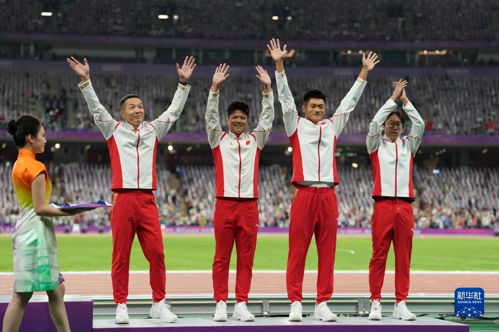 當(dāng)晚,杭州亞運(yùn)會(huì)田徑項(xiàng)目比賽結(jié)束后,中國(guó)奧委會(huì)在杭州奧體中心體育場(chǎng)舉行遞補(bǔ)奧運(yùn)獎(jiǎng)牌頒獎(jiǎng)儀式,為遞補(bǔ)獲得東京奧運(yùn)會(huì)男子4X100米接力銅牌的蘇炳添、謝震業(yè)、吳智強(qiáng)和湯星強(qiáng)與遞補(bǔ)獲得2012年倫敦奧運(yùn)會(huì)女子20公里競(jìng)走金、銀、銅牌的切陽(yáng)什姐、劉虹、呂秀芝頒發(fā)獎(jiǎng)牌。