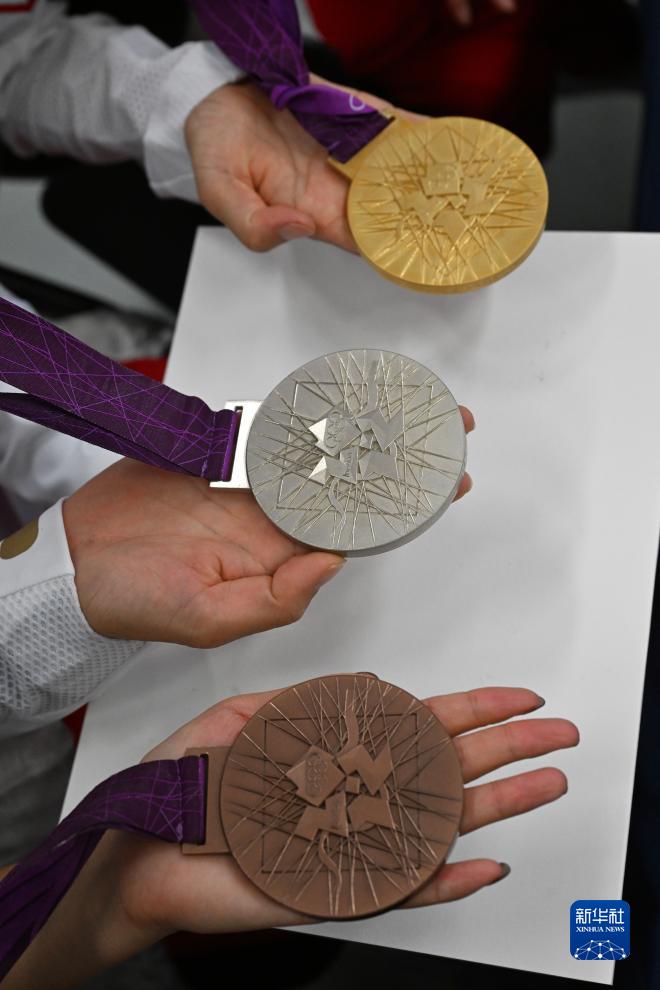 這是切陽(yáng)什姐、劉虹、呂秀芝遞補(bǔ)獲得的2012年倫敦奧運(yùn)會(huì)女子20公里競(jìng)走金、銀、銅牌(10月4日攝)。