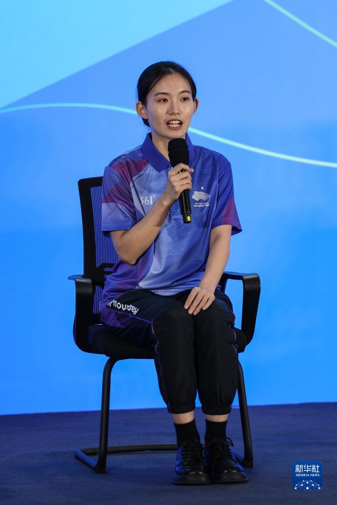 10月7日,杭州奧體中心籃球館競(jìng)賽志愿者李冠霖在見(jiàn)面會(huì)現(xiàn)場(chǎng)發(fā)言。