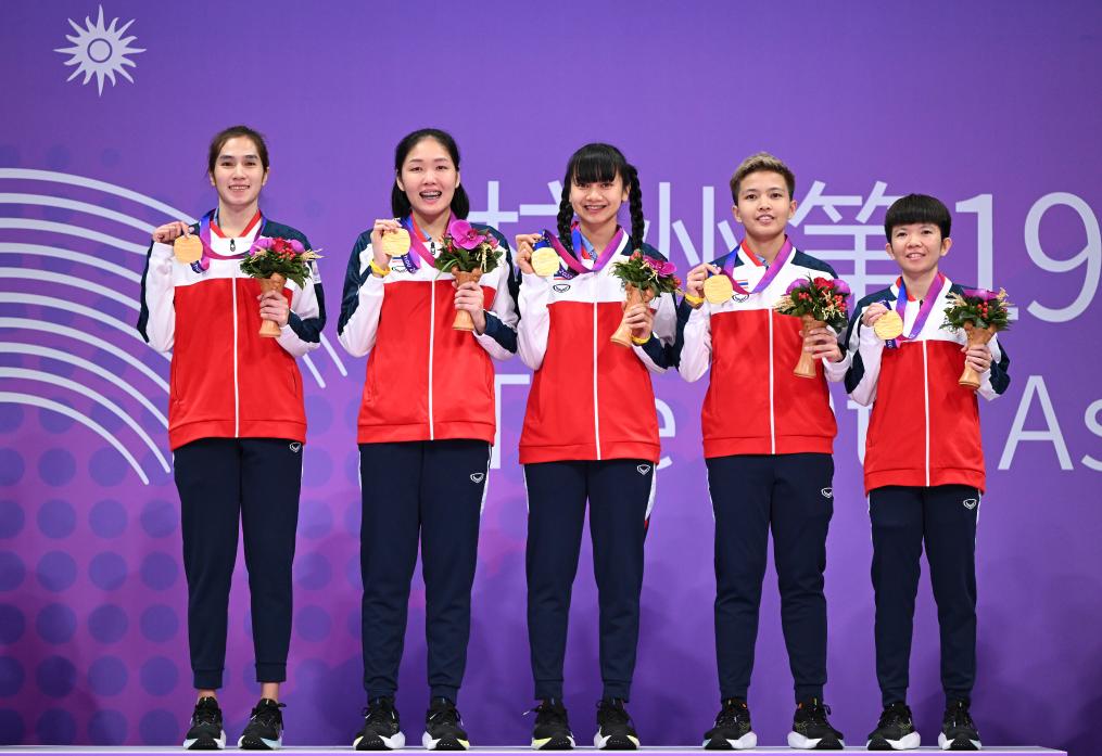 10月7日,杭州亞運(yùn)會藤球女子單組比賽落幕。冠軍泰國隊(duì)在頒獎儀式上。新華社記者 陳鐘昊 攝