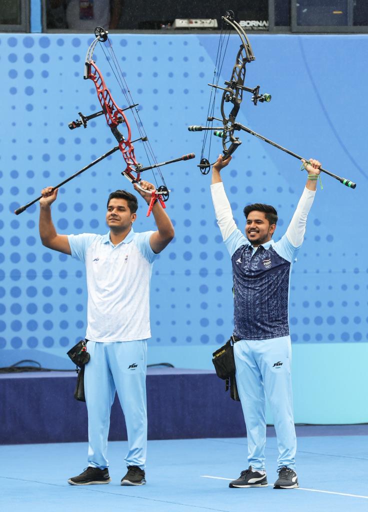 10月7日,在杭州亞運(yùn)會射箭項(xiàng)目男子復(fù)合弓個人賽中,印度選手奧賈斯·普拉溫·德奧塔萊(右)獲得冠軍。新華社記者 單宇琦 攝