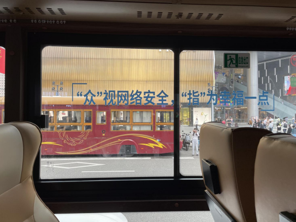 在網(wǎng)絡(luò)普法公交的車(chē)窗上,也“隱藏”著網(wǎng)絡(luò)普法金句——“眾”視網(wǎng)絡(luò)安全,“指”為幸福一點(diǎn)!隨著車(chē)輛在大街小巷間穿梭,沉浸式學(xué)法帶給每位乘客全新的體驗(yàn),普法真正“動(dòng)”了起來(lái)。