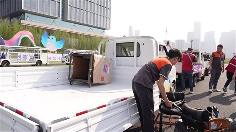由于殘疾運動員的行李相對較多,大件行李的比例也比較高,還包括輪椅等輔助器具,需要小心保護,不能磕碰,亞殘運村運行團隊從各中心緊急抽調(diào)40余名“精兵強將”為運動員提供抵離服務(wù)。大家一方面做好引導(dǎo)工作,陪同運動員和隨隊官員們順利通過安檢,另一方面將隨車行李和行李車上的大件行李搬運下來,運送至行李安檢口。在運動員們進行抵達登記的同時,這些行李已經(jīng)通過了安檢。此時,一條行李運送人力“流水線”形成了:工作人員相互接力,將行李快速運送至“村”內(nèi)行李車。這樣一來,運動員不用奔波勞頓,無需親自動手,體驗“無感服務(wù)”,不知不覺間就與自己的行李一同來到了居住區(qū),美妙的“村生活”即刻開啟。