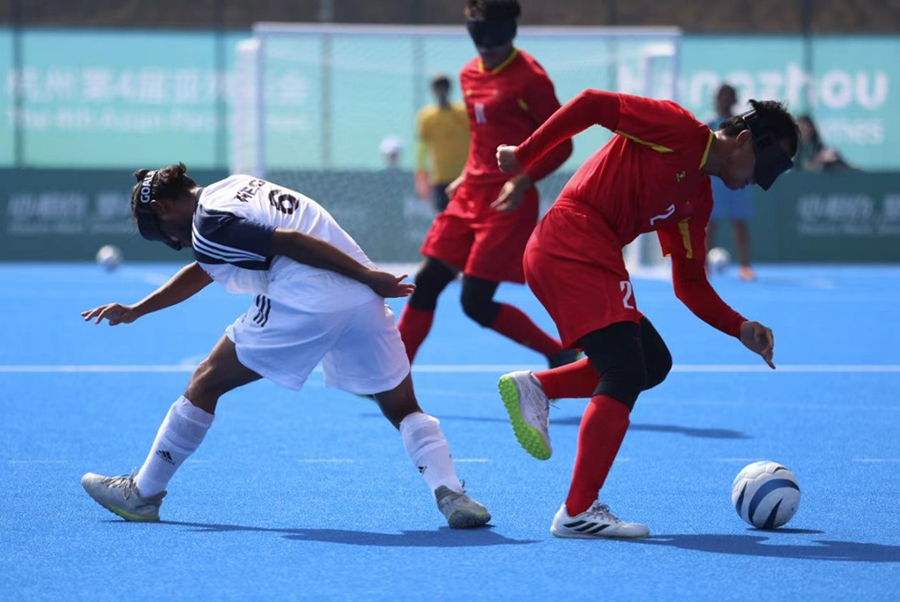 10月23日,杭州亞殘運(yùn)會(huì)盲人足球比賽開賽,首場(chǎng)比賽是中國(guó)盲人男子足球隊(duì)對(duì)陣印度隊(duì)。中國(guó)隊(duì)的綜合實(shí)力更勝一籌,發(fā)動(dòng)了多次頗具威脅的進(jìn)攻,最終以4:0戰(zhàn)勝對(duì)手。