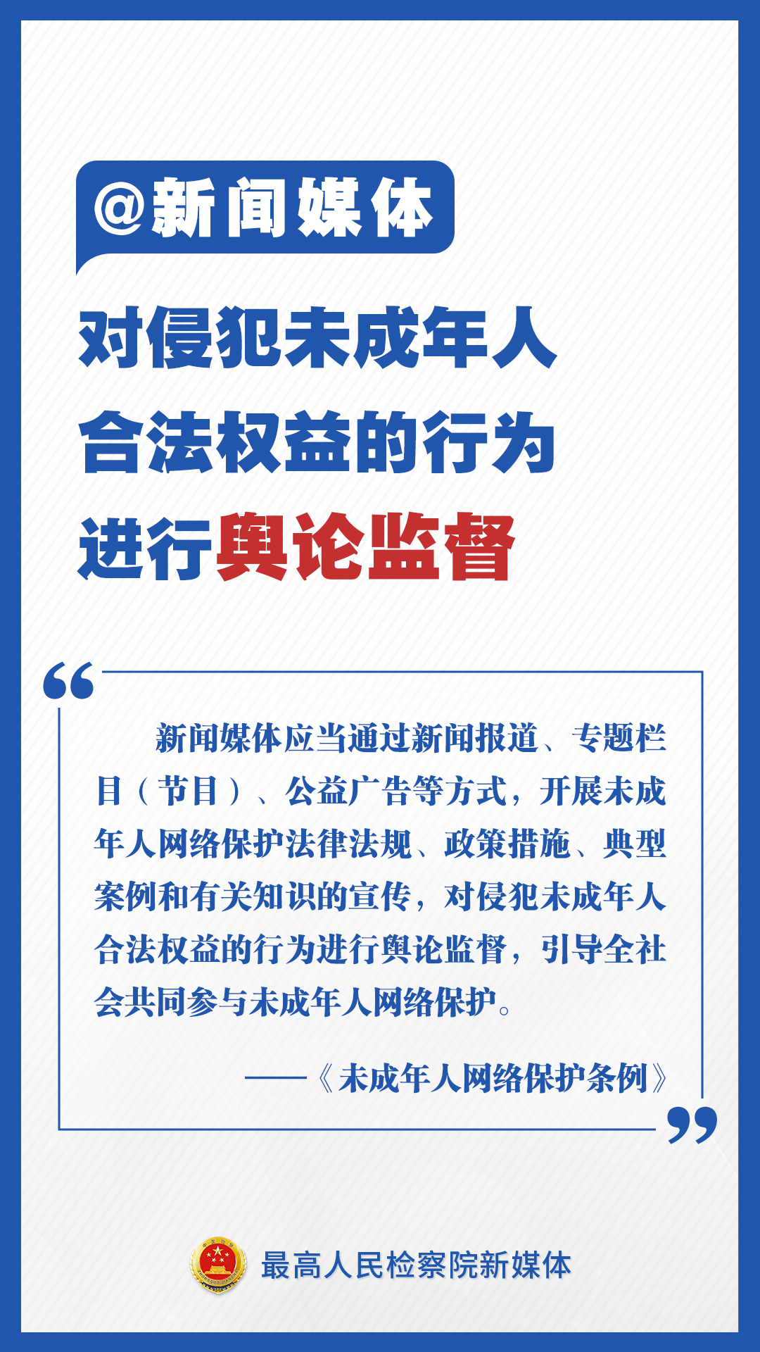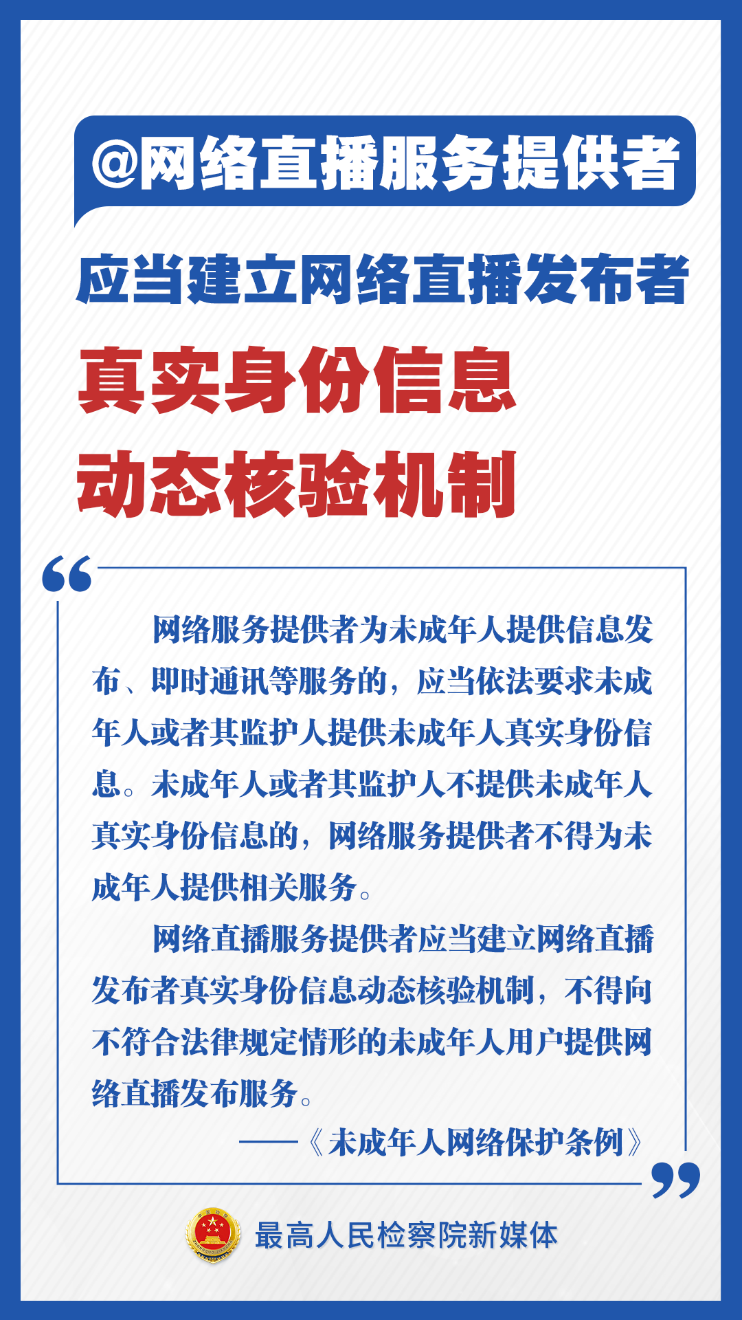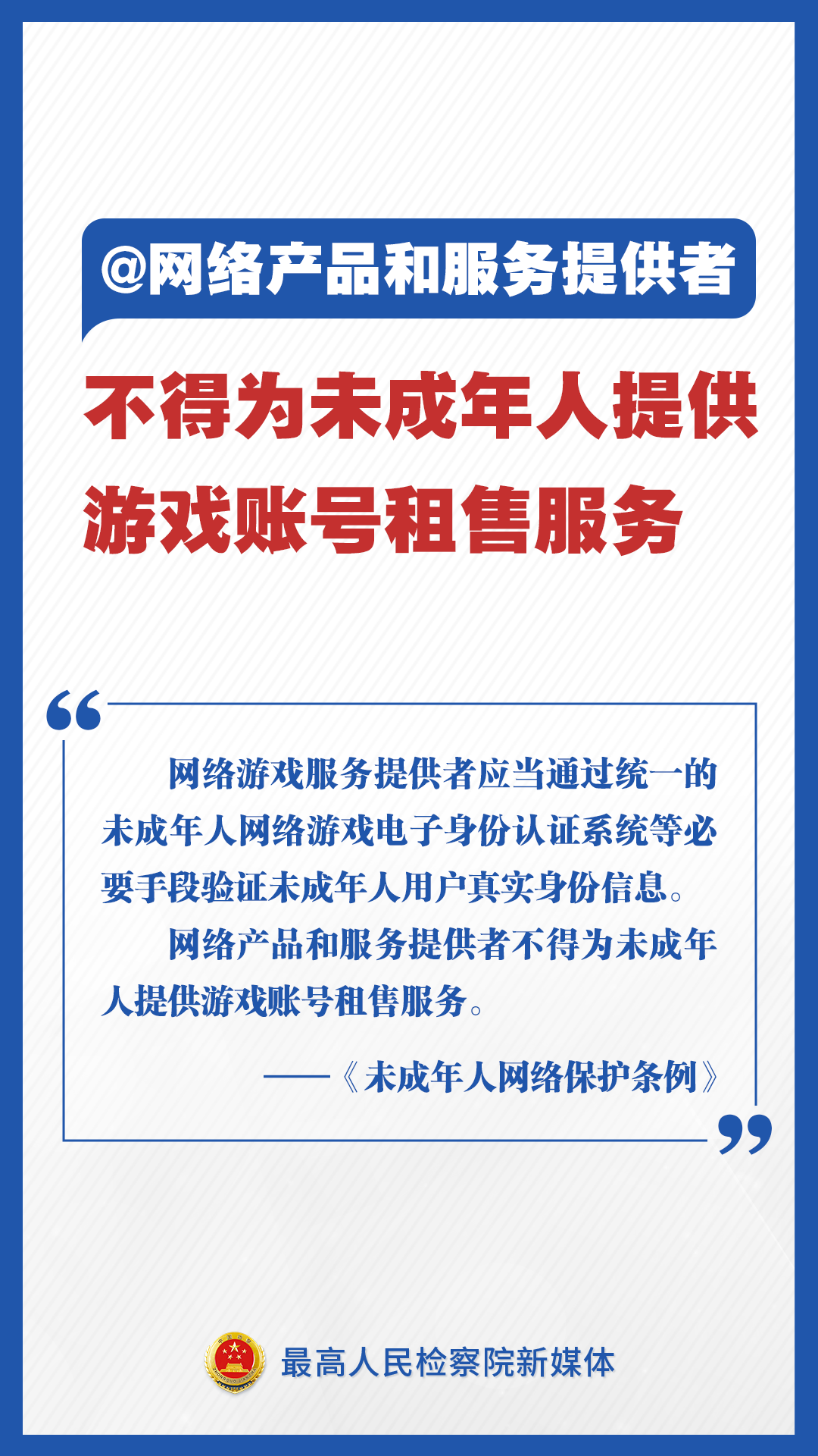 《未成年人網絡保護條例》來了!檢察君為你劃重點,速讀未成年人網絡保護新舉措!不得通過網絡對未成年人實施侮辱、誹謗等網絡欺凌行為;不得為未成年人提供游戲賬號租售服務;建立網絡直播發(fā)布者真實身份信息動態(tài)核驗機制……速速轉發(fā)擴散!