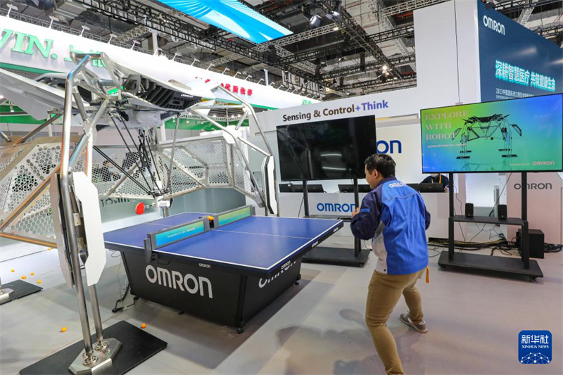 11月2日,工作人員在歐姆龍展位測試乒乓球教練機器人。