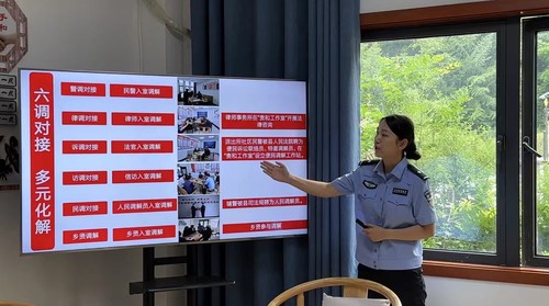 “傳統(tǒng)群眾工作手段主要是依靠人民調(diào)解、行政調(diào)解、司法調(diào)解三調(diào)聯(lián)動,而我們創(chuàng)立的‘貴和’工作法,推行警調(diào)對接、訪調(diào)對接、律調(diào)對接、訴調(diào)對接、民調(diào)對接、鄉(xiāng)賢調(diào)對接的多元化解‘六調(diào)對接’制度,輔警人員聘任為人民調(diào)解員?!眲⒄芟日f。