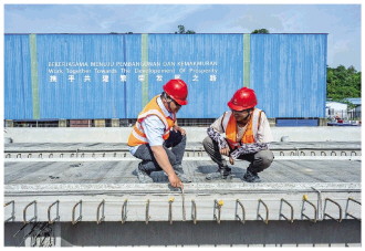 中馬共建“一帶一路”的標志性項目——馬來西亞東海岸鐵路(馬東鐵)建設(shè)如火如荼。圖為2023年4月26日,在馬來西亞吉蘭丹州的馬東鐵項目一分部制梁場,技術(shù)主管鄧友志(右)和馬來西亞本地青年員工鄧德緯討論生產(chǎn)情況。 新華社記者 朱煒 攝