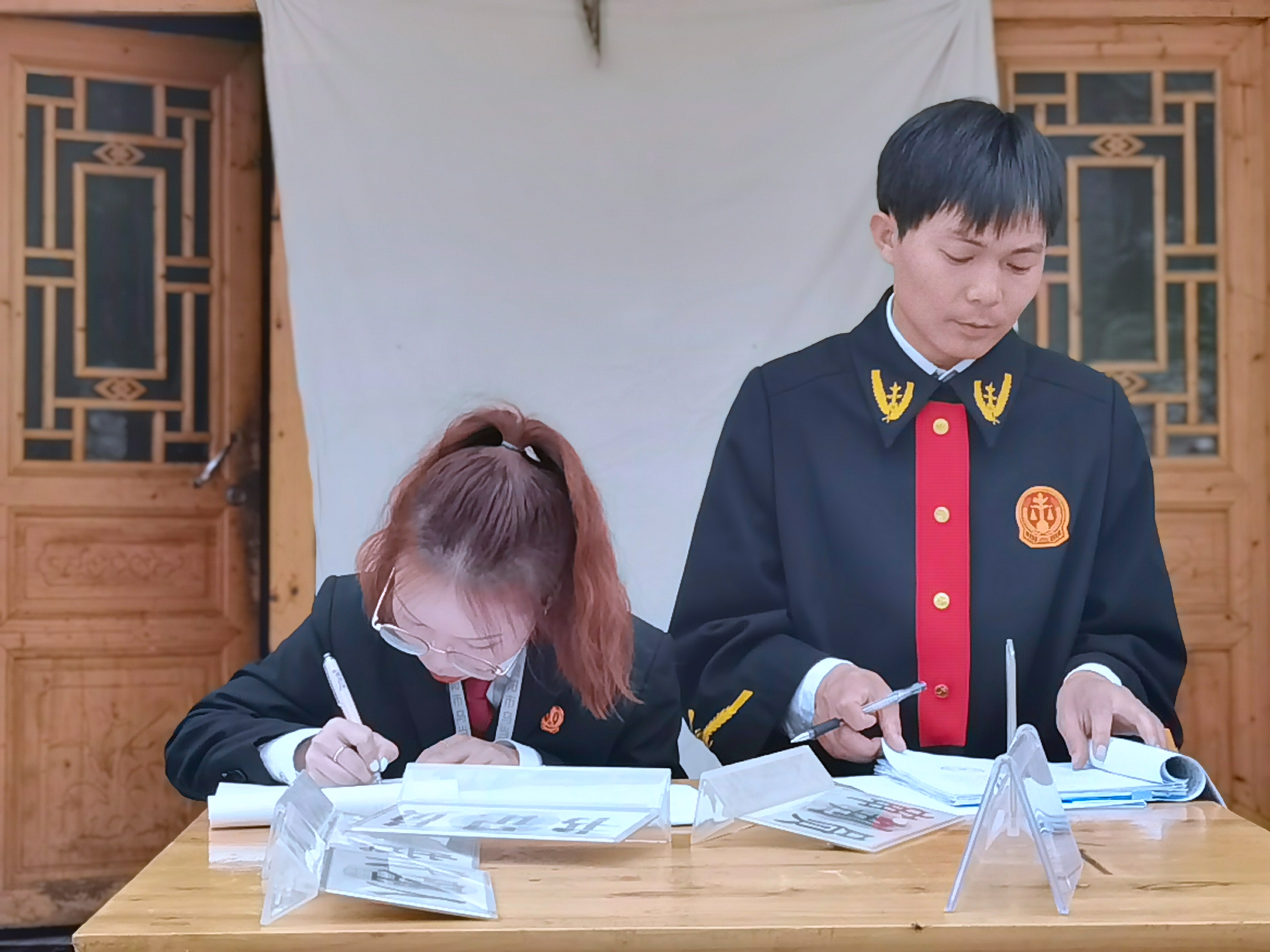 直到開庭前夕,承辦法官還在堅(jiān)持做著被告的釋法析理工作,被告的態(tài)度從始至終無緩,仍表示不愿意到原告家參加庭審,法官對(duì)案件審理效果的擔(dān)憂直到所有訴訟參與人出現(xiàn)在了庭審現(xiàn)場(chǎng)方才散去。由此,國徽之下,法袍加身,飯桌一置,院壩圍坐,這件“家事”便在當(dāng)事人自家“飯桌”上攤開來說了,審理流程依序進(jìn)行......