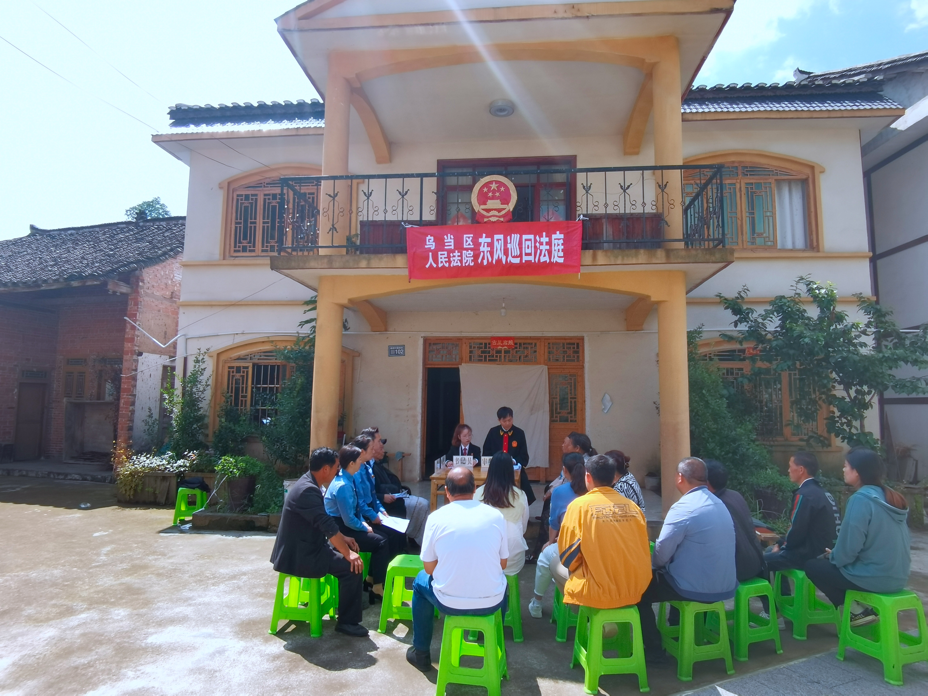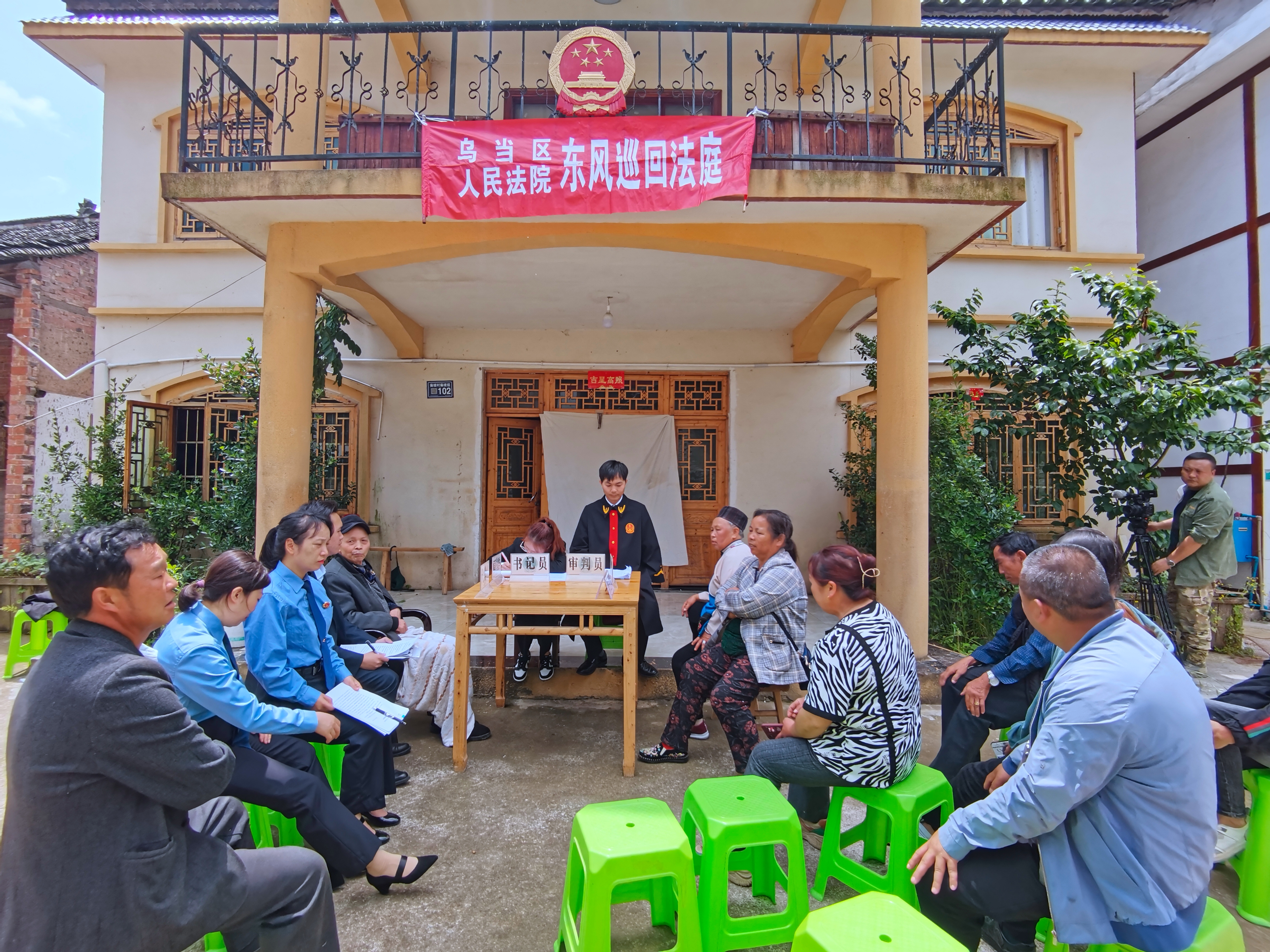 國徽掛欄,庭設(shè)院中,5月16日,烏當(dāng)區(qū)偏坡鄉(xiāng)偏坡村的一處農(nóng)家院里,烏當(dāng)區(qū)人民法院東風(fēng)法庭“就地取材”,在農(nóng)戶家的“飯桌”上進(jìn)行了一場(chǎng)巡回審判,公開審理一起贍養(yǎng)費(fèi)糾紛案件,烏當(dāng)區(qū)檢察院派員出庭支持起訴。案件的訴訟參與人及其親屬、烏當(dāng)區(qū)司法局偏坡鄉(xiāng)司法所、偏坡鄉(xiāng)平安辦等部門人員及部分村民一同參加了庭審。