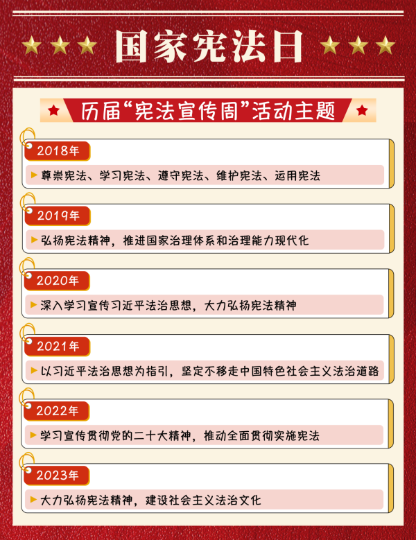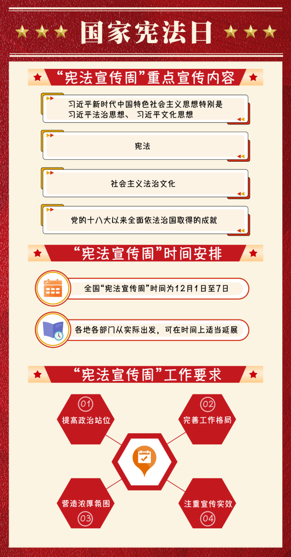2023年12月4日是第十個(gè)國家憲法日,12月1日至7日是第六個(gè)“憲法宣傳周”,主題是“大力弘揚(yáng)憲法精神,建設(shè)社會主義法治文化”。
