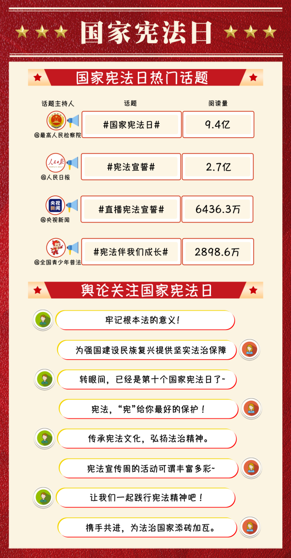在第十個(gè)國家憲法日到來之際,多方積極宣傳相關(guān)信息,形成了多渠道、深層次的傳播格局,為弘揚(yáng)憲法精神創(chuàng)造良好輿論氛圍。“#國家憲法日#”“#憲法宣誓#”等微博熱門話題閱讀量分別達(dá)到9.4億余次、2.7億余次?!稗D(zhuǎn)眼間,已經(jīng)是第十個(gè)國家憲法日了”“傳承憲法文化,弘揚(yáng)法治精神”“攜手共進(jìn),為法治國家添磚加瓦”等網(wǎng)民留言高居評論區(qū)前排。