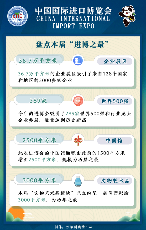 第六屆進(jìn)博會將創(chuàng)造多個“歷史之最”:今年進(jìn)博會企業(yè)展的展覽面積達(dá)到36.7萬平方米,吸引了128個國家和地區(qū)的3000多家企業(yè),規(guī)模為歷史之最;289家世界500強(qiáng)和行業(yè)龍頭企業(yè)參展,數(shù)量達(dá)到歷史新高;中國館升級擴(kuò)容,展覽面積由此前的1500平方米增至2500平方米,規(guī)模為歷屆之最;“文物藝術(shù)品板塊”的展區(qū)面積逾3000平方米,為歷屆之最。
