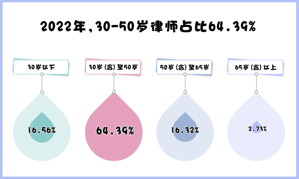 從年齡結(jié)構(gòu)看,截至2022年底,全國律師隊(duì)伍涵蓋老中青各年齡段,其中30歲以下的律師10.79萬多人,占比16.56%,30歲(含)至50歲的律師41.95萬多人,占比64.39%,律師隊(duì)伍呈現(xiàn)年輕化趨勢。