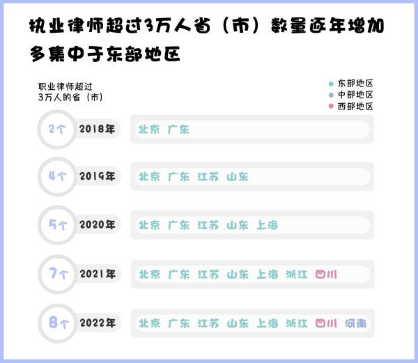 從司法部發(fā)布的數(shù)據(jù)來看,近五年來,律師人數(shù)超過3萬人的省(市)數(shù)量持續(xù)上漲,截至2022年底,共有8個(gè)?。ㄊ校┑穆蓭熑藬?shù)超過3萬,其中除河南、四川外,其余?。ㄊ校┚植荚跂|部地區(qū)。