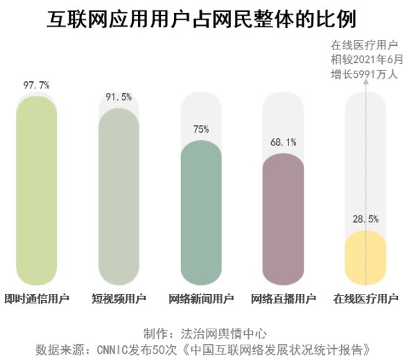 從總體規(guī)模來看,即時(shí)通信用戶規(guī)模達(dá)10.27億,占網(wǎng)民整體的97.7%。短視頻用戶緊隨其后,占網(wǎng)民整體的91.5%。網(wǎng)絡(luò)新聞?dòng)脩粽季W(wǎng)民整體的75.0%。網(wǎng)絡(luò)直播用戶占網(wǎng)民整體的68.1%。在線醫(yī)療用戶占網(wǎng)民整體的28.5%,隨著在線醫(yī)療需求的不斷釋放,在線醫(yī)療行業(yè)呈現(xiàn)出高速發(fā)展態(tài)勢(shì),截至2022年6月,在線醫(yī)療用戶規(guī)模較2021年6月增長5991萬。