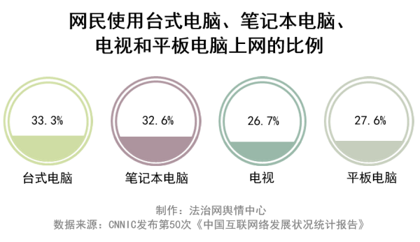 隨著智能手機(jī)普及,移動(dòng)網(wǎng)絡(luò)速度大幅提升,網(wǎng)絡(luò)接入環(huán)境變得多元。據(jù)第50次《報(bào)告》顯示,我國手機(jī)網(wǎng)民已達(dá)到10.47億,占總體的99.6%;使用臺(tái)式電腦、筆記本電腦、電視和平板電腦上網(wǎng)的比例分別為33.3%、32.6%、26.7%和27.6%。