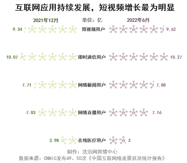 近年來,互聯(lián)網(wǎng)應(yīng)用場(chǎng)景得到極大豐富,短視頻既迎合了互聯(lián)網(wǎng)發(fā)展規(guī)律,又滿足了人們對(duì)多樣化的內(nèi)容需求,用戶數(shù)量不斷攀升。據(jù)第50次《報(bào)告》顯示,截至2022年6月,我國短視頻的用戶規(guī)模增長明顯,達(dá)9.62億,較2021年12月增長2805萬,其用戶規(guī)模增長量在即時(shí)通信用戶(2042萬)、網(wǎng)絡(luò)新聞?dòng)脩簦?698萬)、網(wǎng)絡(luò)直播用戶(1290萬)、在線醫(yī)療用戶(196萬)幾大群體中居首。