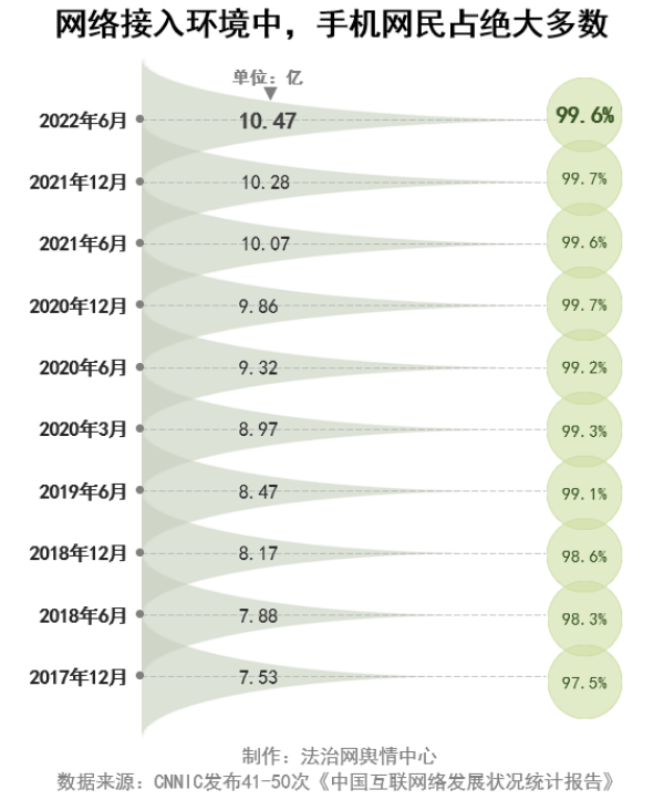 從2017年12月到2022年6月網(wǎng)民規(guī)模對(duì)比數(shù)據(jù)可以看出,我國網(wǎng)民規(guī)模持續(xù)增長。2020年12月相較于2020年6月網(wǎng)民增長數(shù)量更是突破了4900萬人。
