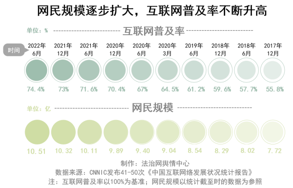 隨著互聯(lián)網(wǎng)的不斷普及,我國網(wǎng)民規(guī)模持續(xù)增長。據(jù)41次-50次(2017年12月-2022年6月)《報(bào)告》顯示,截至2022年6月,我國互聯(lián)網(wǎng)普及率已達(dá)74.4%,較2021年12月提升1.4個(gè)百分點(diǎn),網(wǎng)民規(guī)模達(dá)10.51億。
