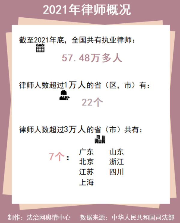 2017年至2021年,我國執(zhí)業(yè)律師人數(shù)每年都在以超過10%的速度增長。截至2021年底,全國共有執(zhí)業(yè)律師57.48萬多人,律師人數(shù)超過1萬的?。▍^(qū)、市)有22個(gè),律師人數(shù)超過3萬的?。ㄊ校┯?個(gè)。
