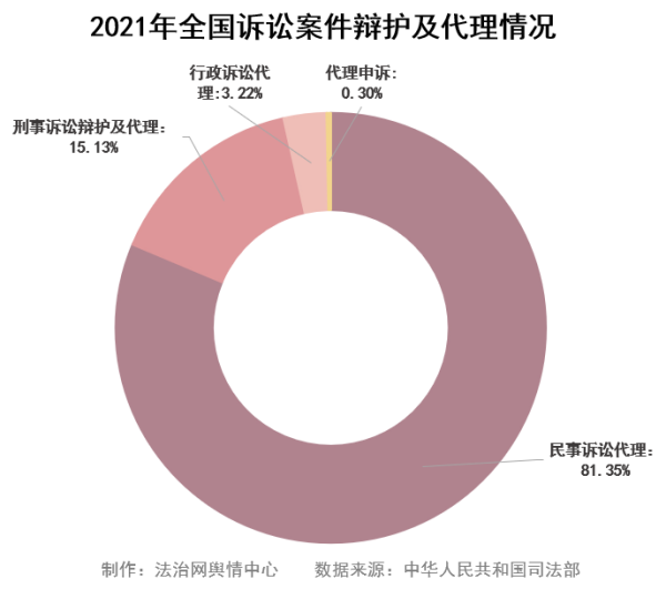 在律師辦理的811.6萬多件訴訟案件中,刑事訴訟辯護(hù)及代理122.8萬多件,占訴訟案件的15.13%;民事訴訟代理660.1萬多件,占訴訟案件的81.35%;行政訴訟代理26.2萬多件,占訴訟案件的3.22%;代理申訴2.4萬多件,占訴訟案件的0.30%。