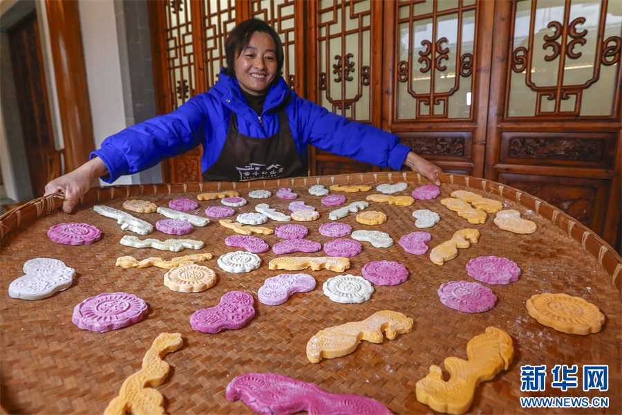 1月18日,在安徽省黃山市徽州區(qū)潛口鎮(zhèn)潛口村,村民用模具制作的多彩徽州米粿。