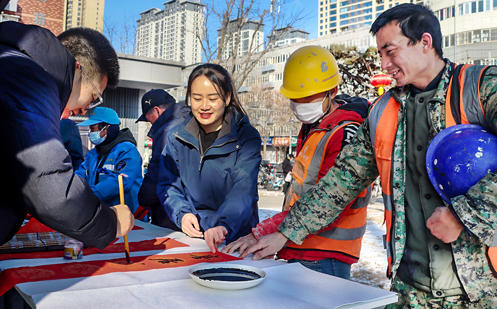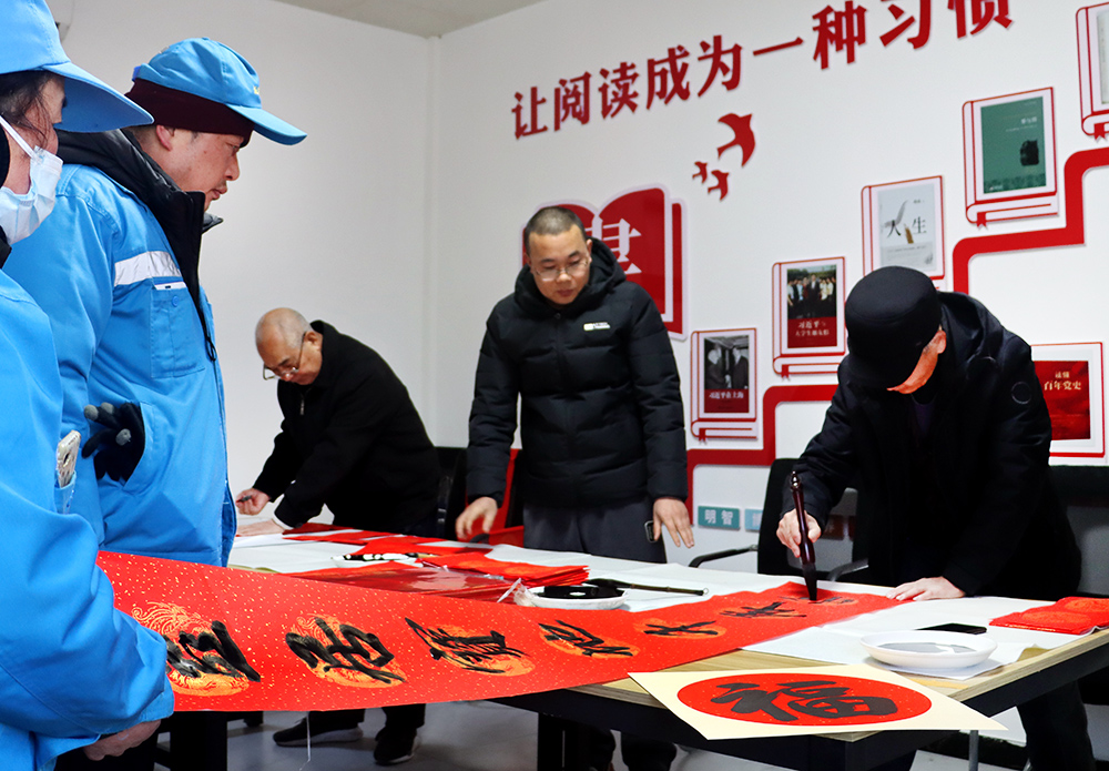 活動(dòng)現(xiàn)場(chǎng),長(zhǎng)安區(qū)總工會(huì)邀請(qǐng)的多位知名書法家現(xiàn)場(chǎng)揮毫潑墨,把對(duì)新春的美好愿望傾注筆尖,書寫出一副副寓意美好、包含祝福的春聯(lián)和“?!薄sA站周邊的環(huán)衛(wèi)工人、停車收費(fèi)員,快遞小哥及市民群眾,高興地挑“?!弊帧⑦x春聯(lián),提前感受到了濃濃的“年味”