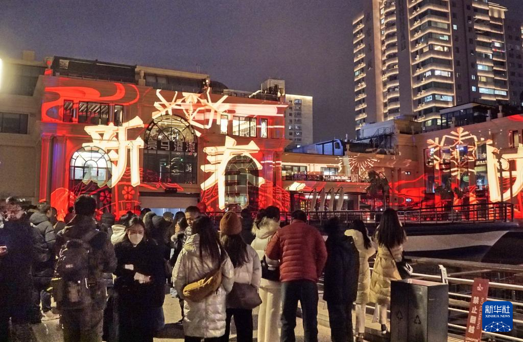 市民在亮馬河畔觀賞激光投影(2月2日攝)。