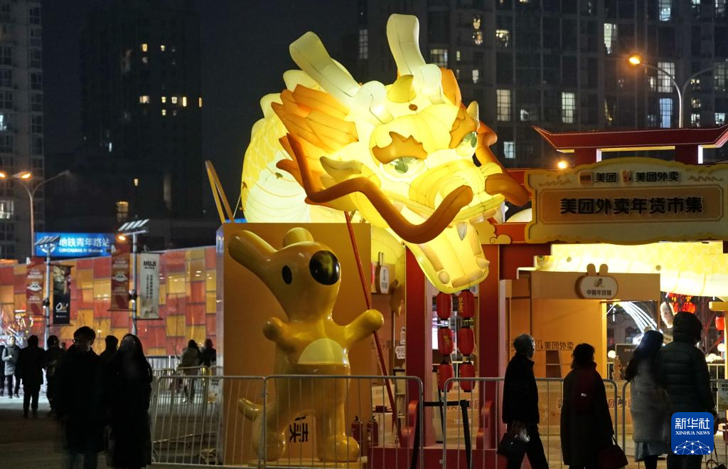 朝陽區(qū)一家商場門口安裝的龍燈(2月2日攝)。